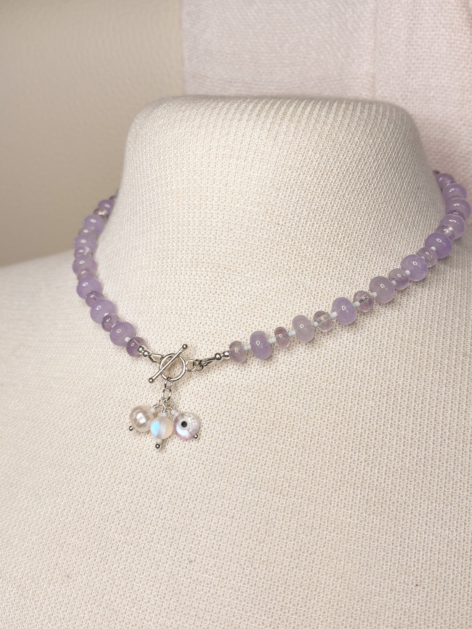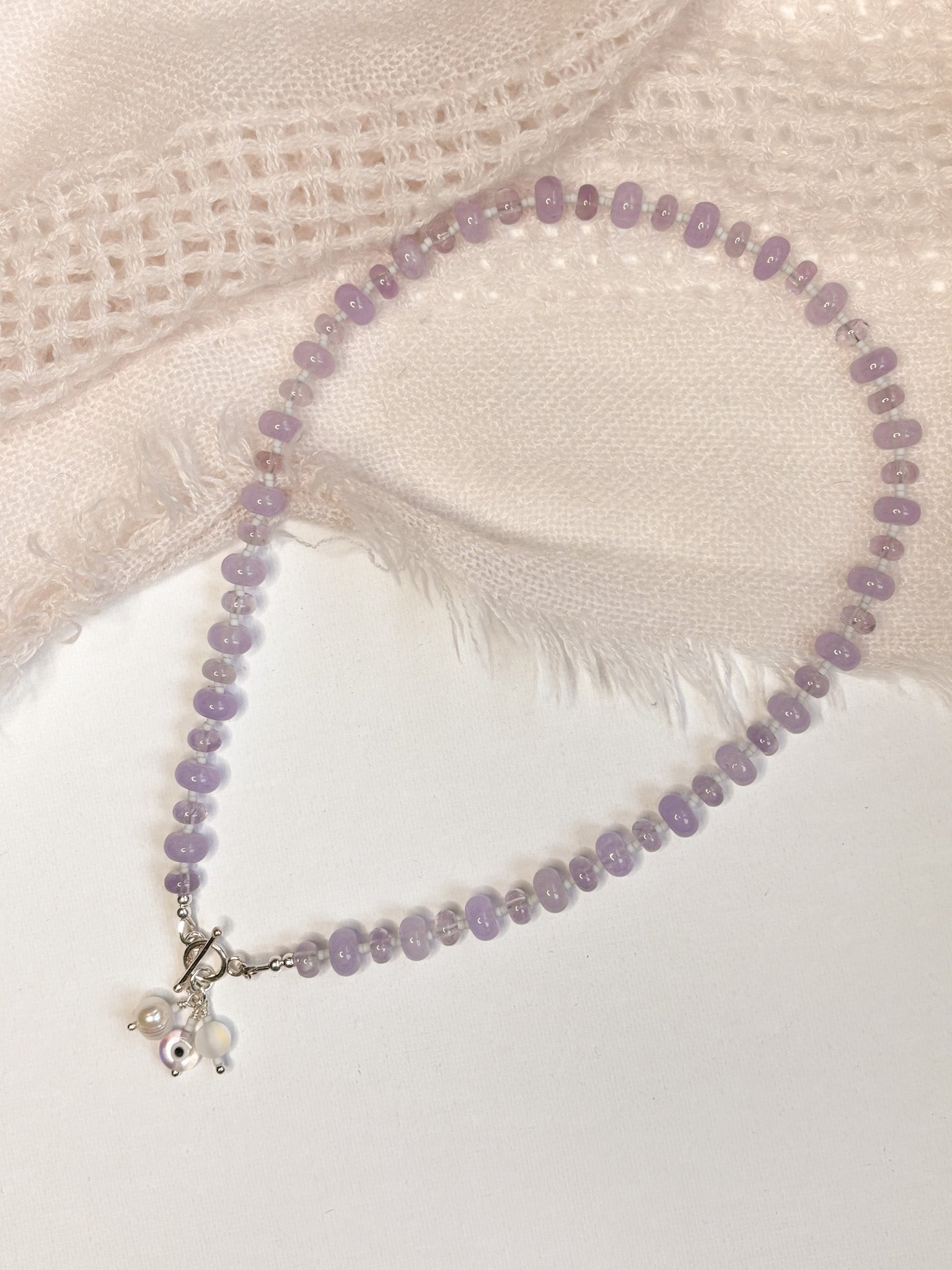 All spacer beads between the gemstones are glass seed beads.